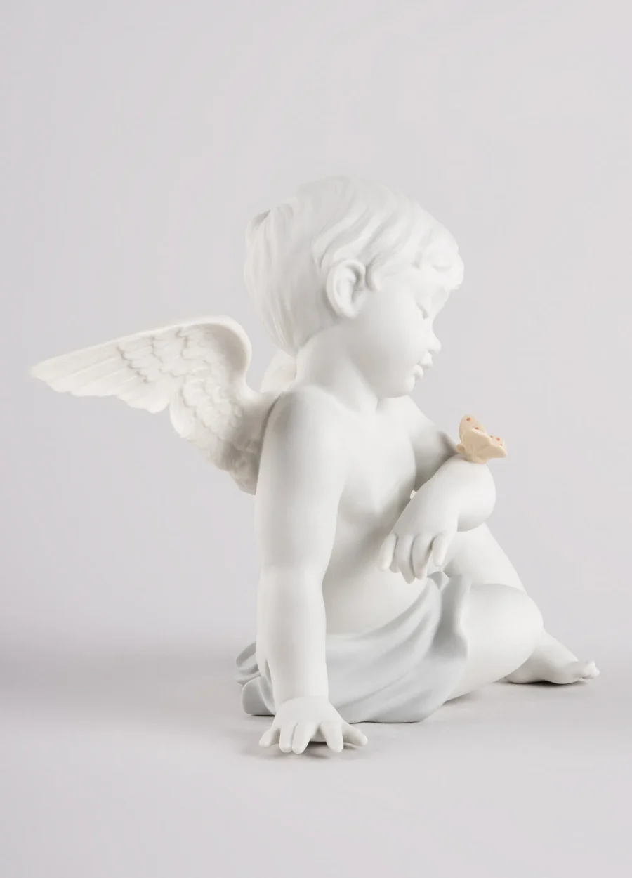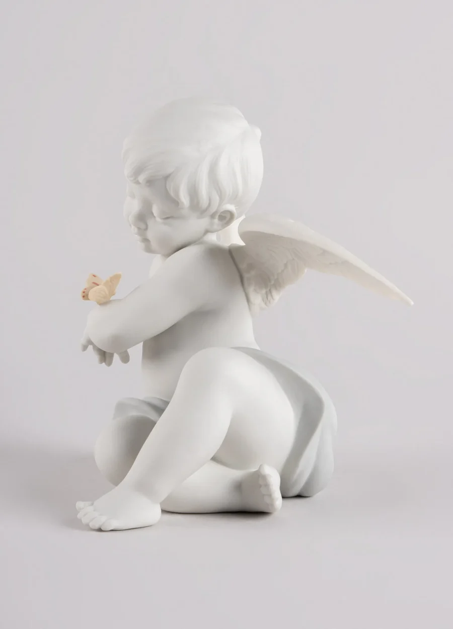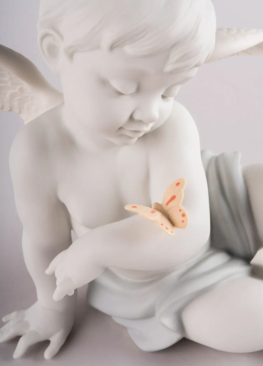 Angelical moments Angels, the stars of many creations coming from the Lladró workshops, now have a new depiction. A cherub, with perfectly executed facial features and exquisitely etched wings, looks in wonder at a cute little butterfly that has landed on his arm. Made in matte white porcelain with subtle notes of color, the scene produces tender emotions. (Click for more details)
