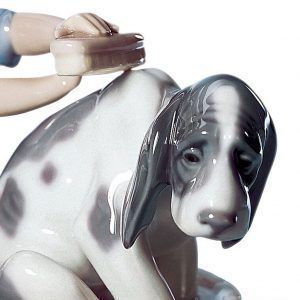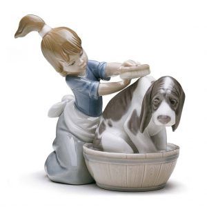 He allows himself to be washed with an amusing expression of resignation. He knows that she enjoys the game and that is reward enough. A piece of glossy porcelain, decorated in soft pastel colours, ideal as a gift, collectible or decoration.