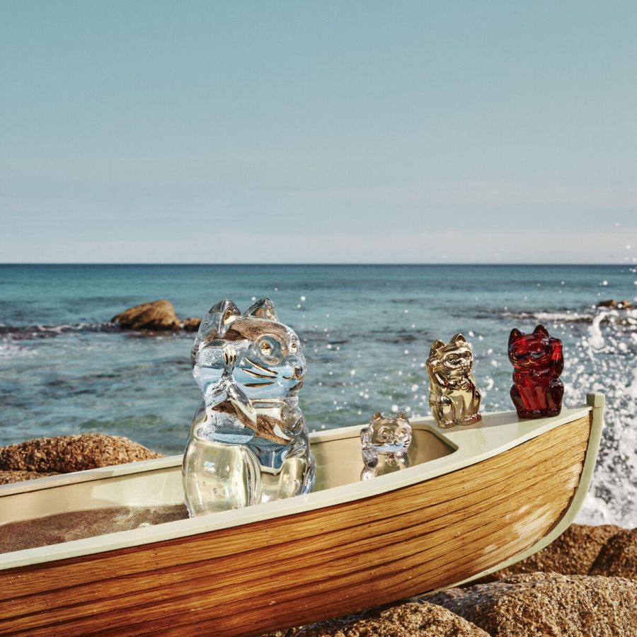 CAT MANEKI NEKO FIGURINE S The feline creature with cartoonish features is seen beckoning with its right hand a gesture that is said to protect one’s fortune. This Baccarat Clear crystal cat, or the Maneki-neko as it is called in Japanese, has a lot of careful detail. Baccarat’s painstaking technique are evident in the paws, the facial features, and the collar. Additional gilded flourishes are applied to the cat’s ears, eyes, mouth, and whiskers. This emblem of luck is a meticulously crafted piece that could draw good fortune directly into your home. The Lucky cat is also available in midnight crystal.