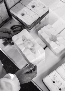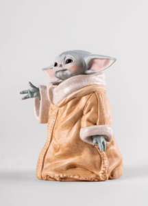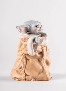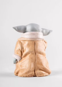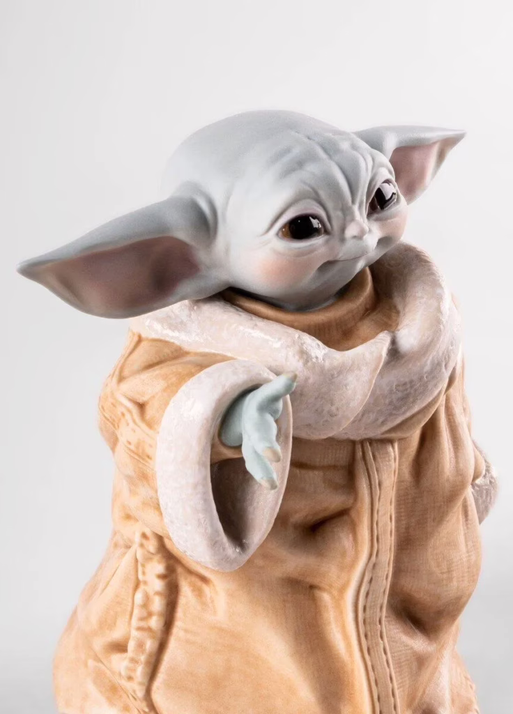 Grogu™ Sculpture is a cute little character who quickly conquered the hearts of countless fans of the Star Wars saga ever since he first appeared in The Mandalorian series. The sculptural work in this creation, handcrafted in porcelain, is particularly outstanding for the perfect likeness of the character and for the different decorative techniques used. His face, ears and hands are decorated with liquid colors, perfect for underscoring all the details of the skin, like the little frown lines, the dimple and the shape of the ears. Pearly touches are also used for the cheeks, as well as soft stony grey and pink tones. A matte camel color was chosen for his robe, combined with off-white for the collar and sleeves. The off-white color is applied using a technique of painting and erasing that increases the effect of depth in the fabric. And, of course, a special mention is deserved for Grogu™’s eyes, the only detail for which glazed effects were used, with the goal of making this gaze more intense and alive. Contact Us