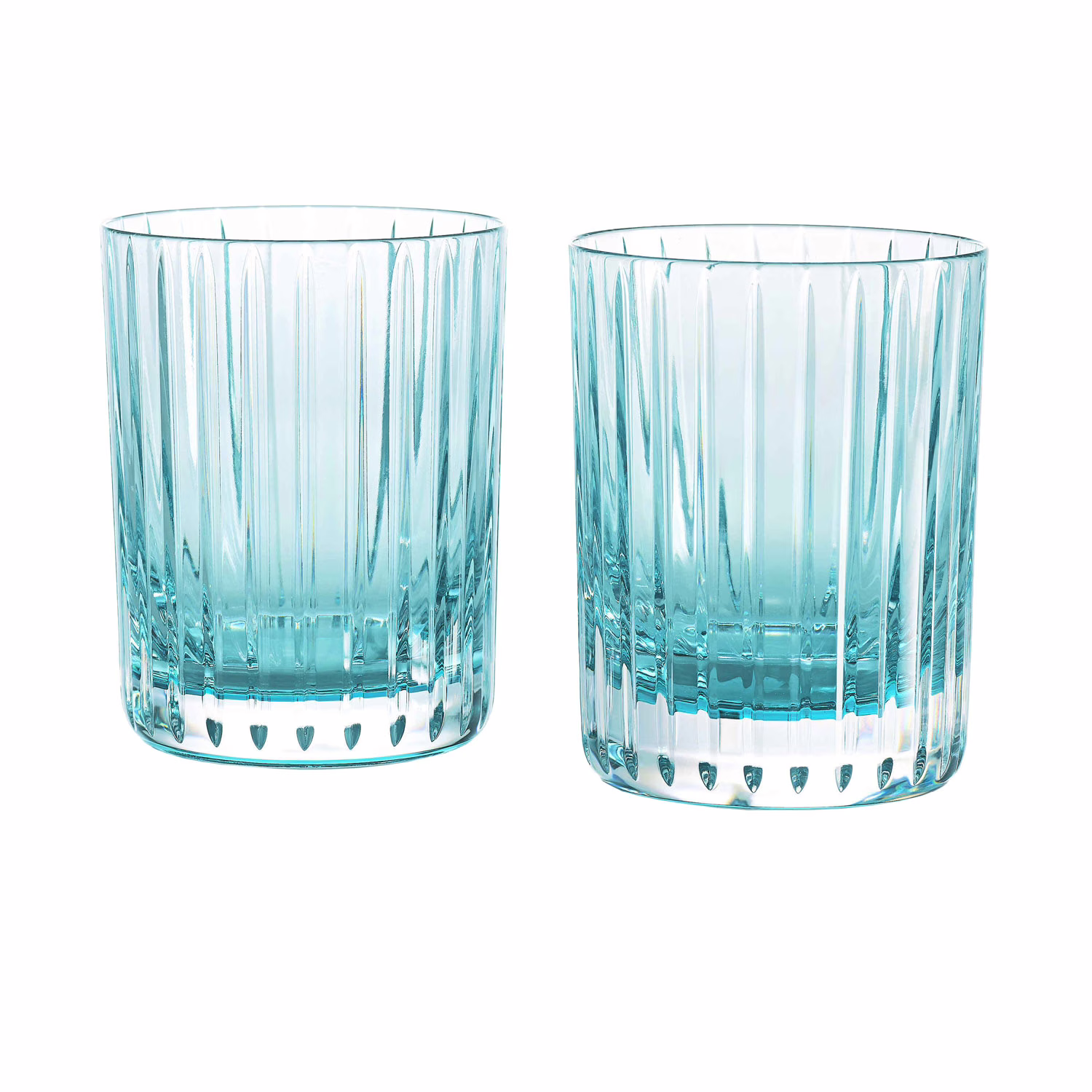 Double cased crystal tumblers in a brilliant pastel turquoise, as refreshing as it is invigorating.