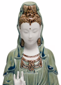 Kwan Yin Figurine Green is the best-loved goddess of Chinese culture. She abounds with love and embodies grace and beauty. Her particular attribute is Mercy, and she is within the reach of anyone. She understands the nature of fear and anguish, comforting those who suffer with compassion. Square wooden base. Made in white porcelain covered in strong green enamels, which give it a unique effect of shadow and chiaroscuro nuances. A glossy white finish version is also available (ref. 01008302). Contact Us