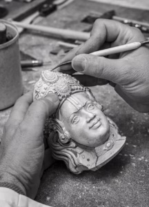 The piece was created in collaboration with sculptor Dr. Arun Yogiraj, author of the consecrated image in the Ayodhya temple. Following the principles of Shilpa Shastra, our sculptor Raúl Rubio faithfully reinterpreted his work in porcelain, together with our ornamentation and decoration teams.The inspiration comes from the temple, where every Ram Navami a ray of sunlight touches the deity’s forehead: the Surya Tilak, a symbol of blessing and cosmic harmony.
