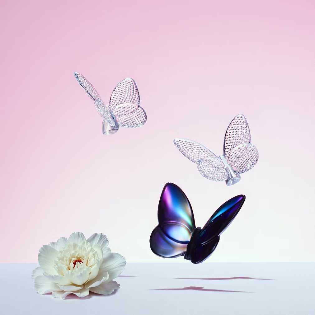 Lucky Butterfly Clear A small and precious lucky-charm object, the Baccarat butterfly gilded with fine gold features a diamond cut giving brilliant reflections of light. Wherever you place it, the slightly inclined wings express span and lightness. Like in nature, this dazzling creature exists in a wide range of bright colours: mauve, blue, peony, moss green, violet, ruby red, amber and turquoise. A stylish gift for every occasion. Contact Us