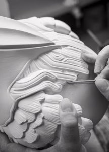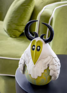 The hand-carved wings recall the original character, adding texture, volume, and dynamism. The glazed finish on the face and horns introduces a play of light that heightens the expressiveness of the piece.