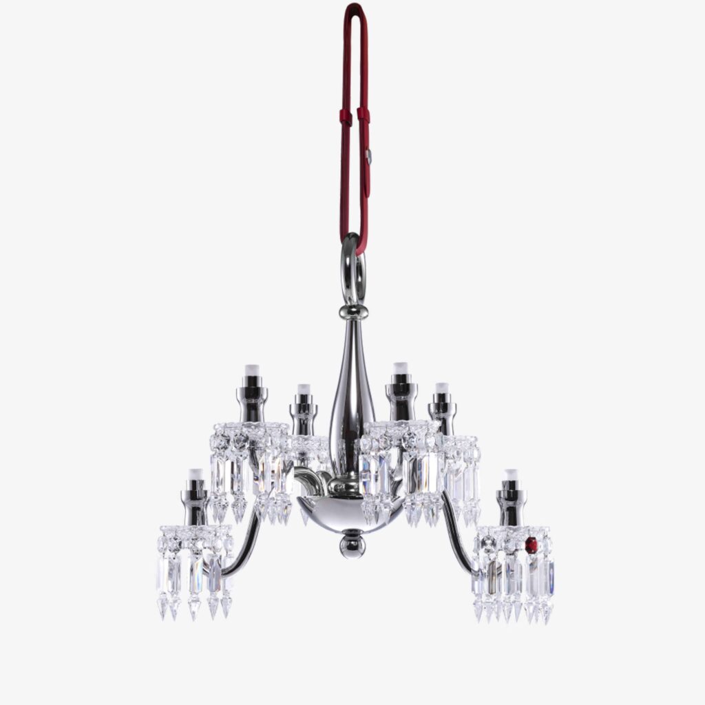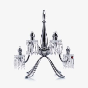 Zénith Nomade Chandelier (06L) The Zénith chandelier, a Baccarat icon born in the 19th century, is boldly reimagined. Freed from all constraints, it becomes Zénith Nomade, exploring new realms to offer an unprecedented experience of light — innovative, mobile, and unique. Cordless, autonomous, and rechargeable, each piece in the collection can be effortlessly moved to suit any desire. Indoors or outdoors, placed on a table, suspended from a branch, or displayed as a work of art, Zénith Nomade awakens the imagination and creates surprise where it is least expected. Designed by Controvento under the creative direction of Gabriele Chiave, Zénith Nomade embodies the union of heritage and innovation. Remaining true to the DNA of the original chandelier, with its octagons, prisms, and drip saucers, it is enriched with a contemporary structure in chrome-finished metal, with delicate curves intended to accompany movement with elegance. A mirrored effect enhances the collection’s distinctly modern allure, playing with the crystal to cast subtle reflections. The ultimate Baccarat signature, an iconic red pendant adorns each piece. Available in two Nomade chandelier sizes (6 and 8 lights) and as a lamp (2 lights), the collection has been designed with modularity in mind. Thanks to an ingenious system of interchangeable bases, the 6- and 8-light Nomade chandeliers can be transformed into table lamps or floor lamps when suspended from a tall stand. Equipped with innovative LED technology, the Zénith Nomade collection offers personalized lighting. The chandelier’s central ring, an aesthetic and functional signature, extends this new freedom by allowing the light intensity to be adjusted with a simple gesture. A living light, in harmony with every moment. “Zénith Nomade was born from a vision: to take the chandelier down from the ceiling and hang it on a tree branch, to trade the gentle light of the moon for the dazzling brilliance of Zénith, and to dine under a reimagined sky.” — Gabriele Chiave, Controvento. Contact Us